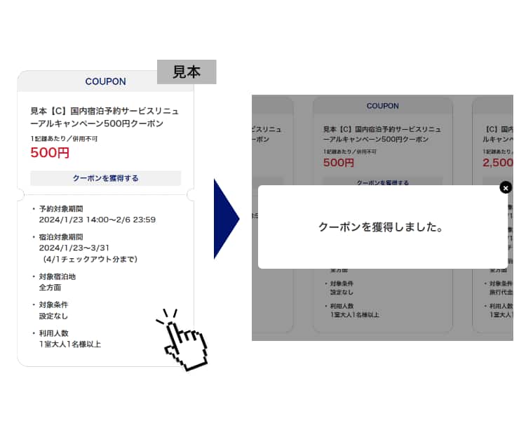 お客様の予約条件と合わない場合や有効期限を過ぎた場合、上限枚数に達した場合等で、クーポンを利用することができない場合があります。