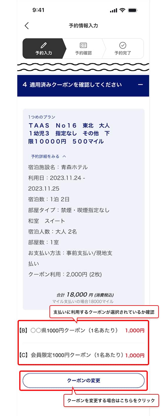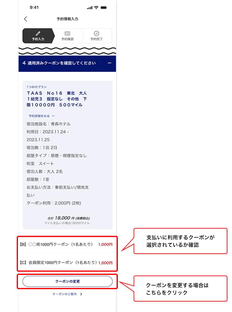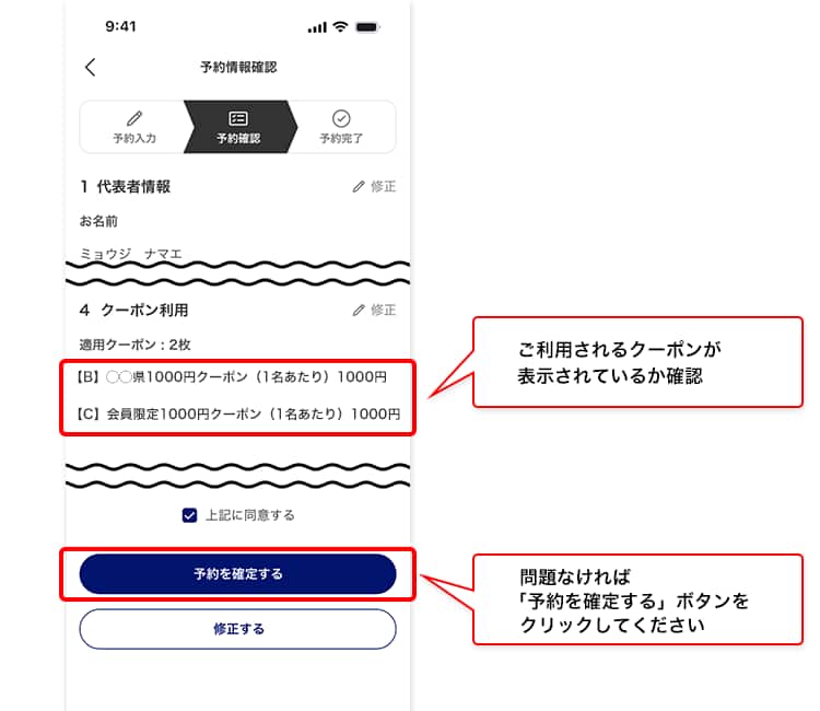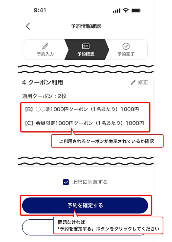 予約情報を確認する画面でクーポンが適用されているか確認し、予約を完了してください。