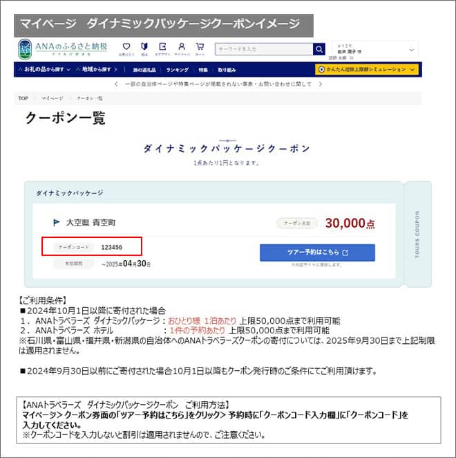 クーポンは「ANAのふるさと納税」マイページから受け取りができますのでクーポン内容と有効期限をご確認ください。