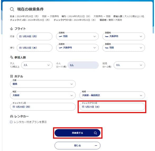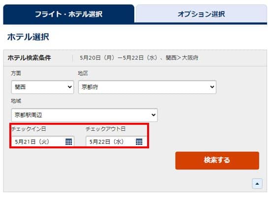 「現在の検索条件」で、行きと帰りのフライト利用日、出発地、到着地、参加人数を確認します。ここで初日に宿泊するホテルのエリア、チェックイン日、チェックアウト日を指定し「再検索する」ボタンをクリックします。