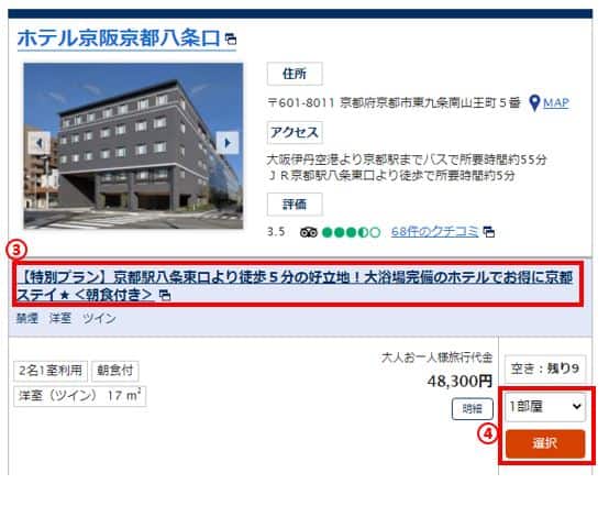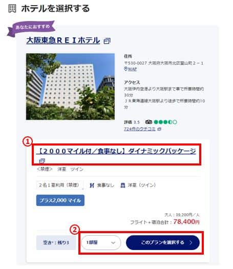中日に宿泊するホテルの宿泊プラン名(または宿泊施設名)をクリックすると部屋とプラン詳細が表示されます。