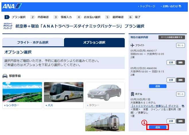 レンタカーやパークチケットなどオプションをご希望の際はこの画面で取得します。