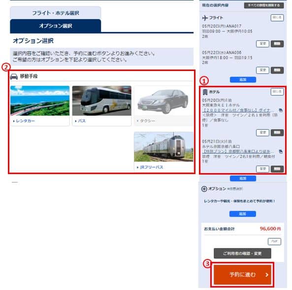 右の「現在の選択内容」にご希望のフライト、ホテルが入ったことを確認します。