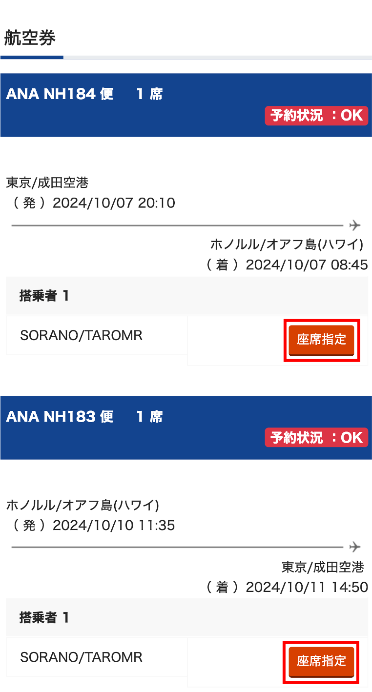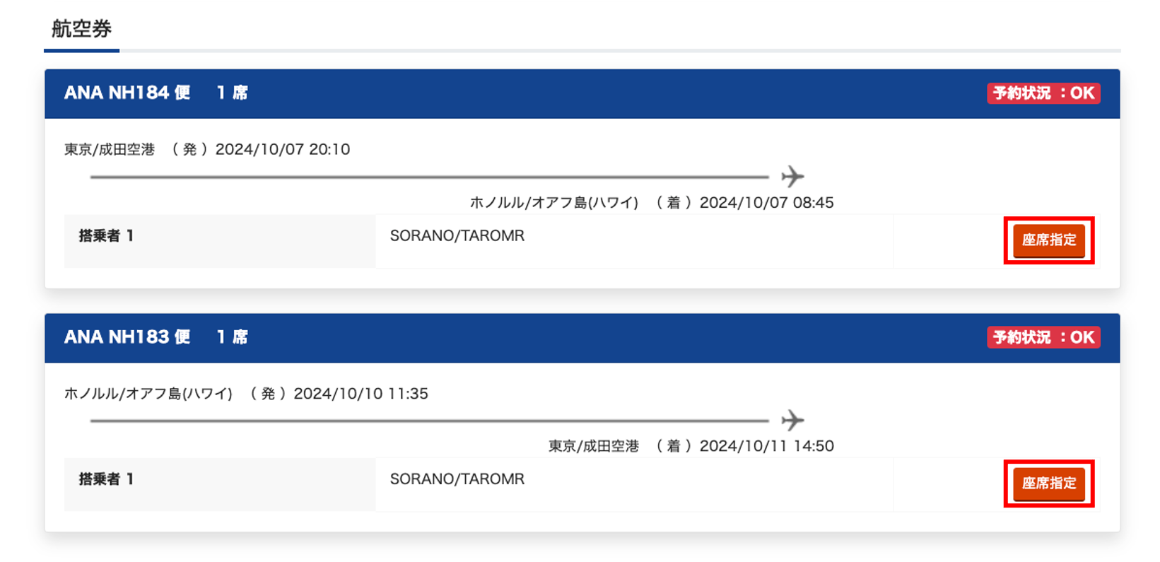 ページ中段「航空券」部分より、座席を指定したい便の「座席指定」をクリックします。