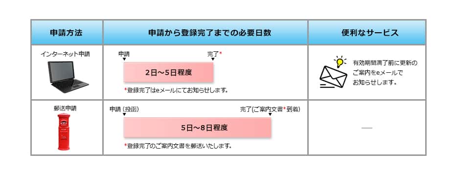 ゴールデンウィーク、年末年始などの連休をはさむ場合は登録までに時間がかかる場合がございます。