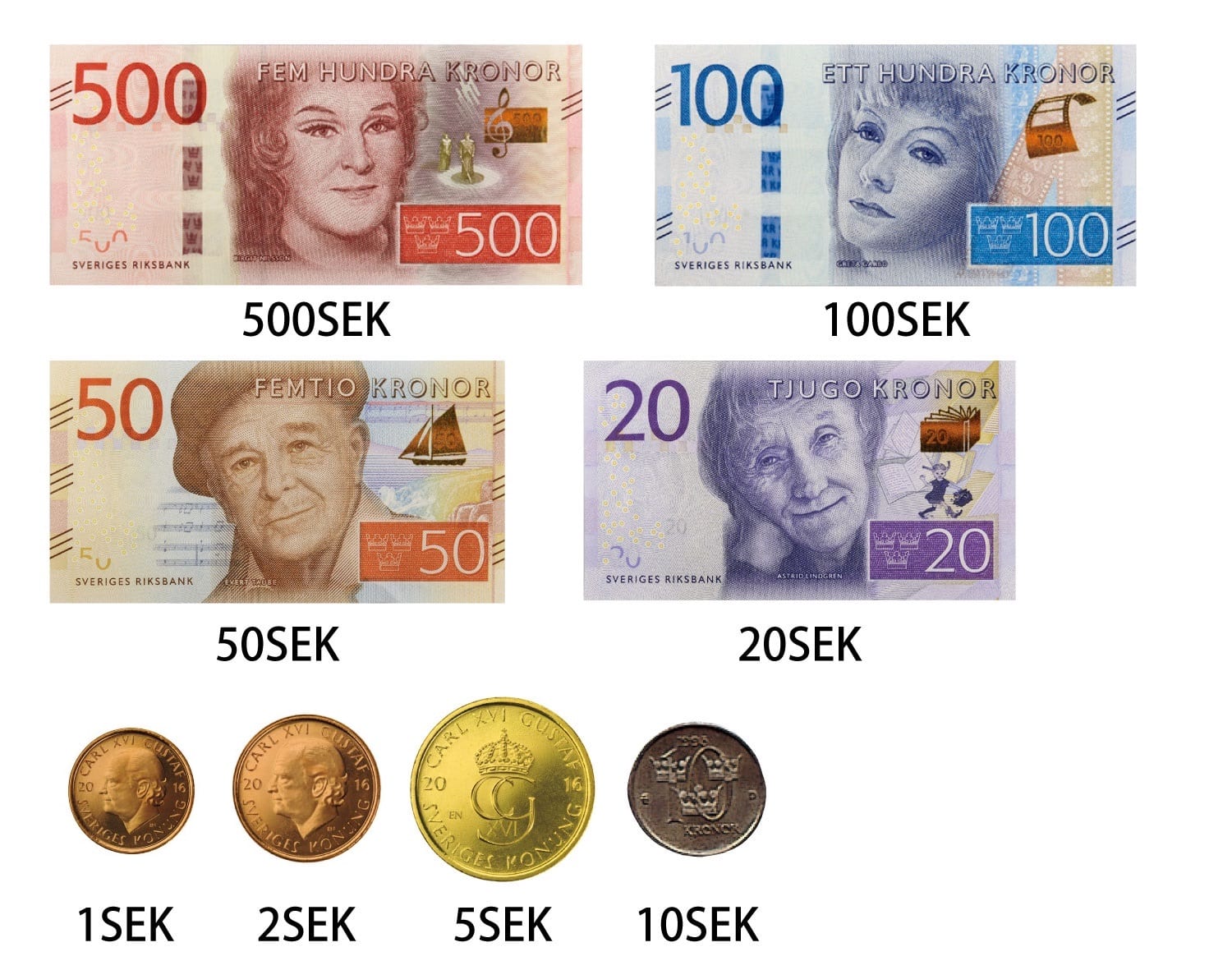 紙幣は20、50、100、200、500、1000SEKの6種類、コインは1、2(ほぼ出回っていない)、5、10SEKの4種類。ただし、国内ではキャッシュレス化が進み、公共機関の券売機は大半が現金不可。クレジットやデビットなどのカードやSwishというスマホアプリによる決済が主流で、現金不可の店舗や観光施設も増えている。渡航の際は必ずクレジットカードを用意すること。