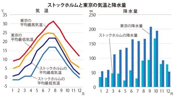 ストックホルムと東京の最高気温・最低気温、月間降水量