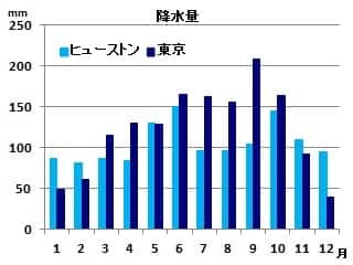 | 月 | 東京の平均降水量 | ヒューストンの平均降水量 |