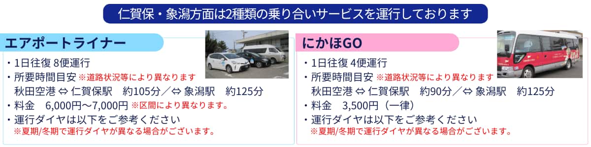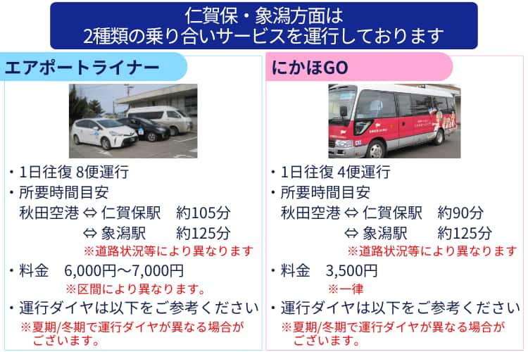 | ご利用料金 | エアポートライナー 6,000円~7,000円 にかほGO 一律3,500円 エアポートライナーの料金は運行区間により異なります。遷移先の予約サイトで料金をご確認ください。 |