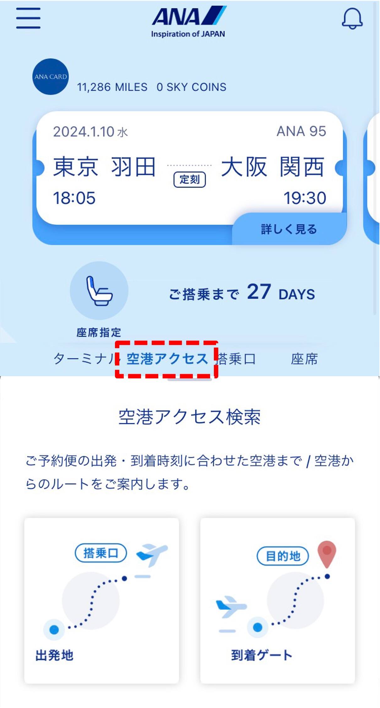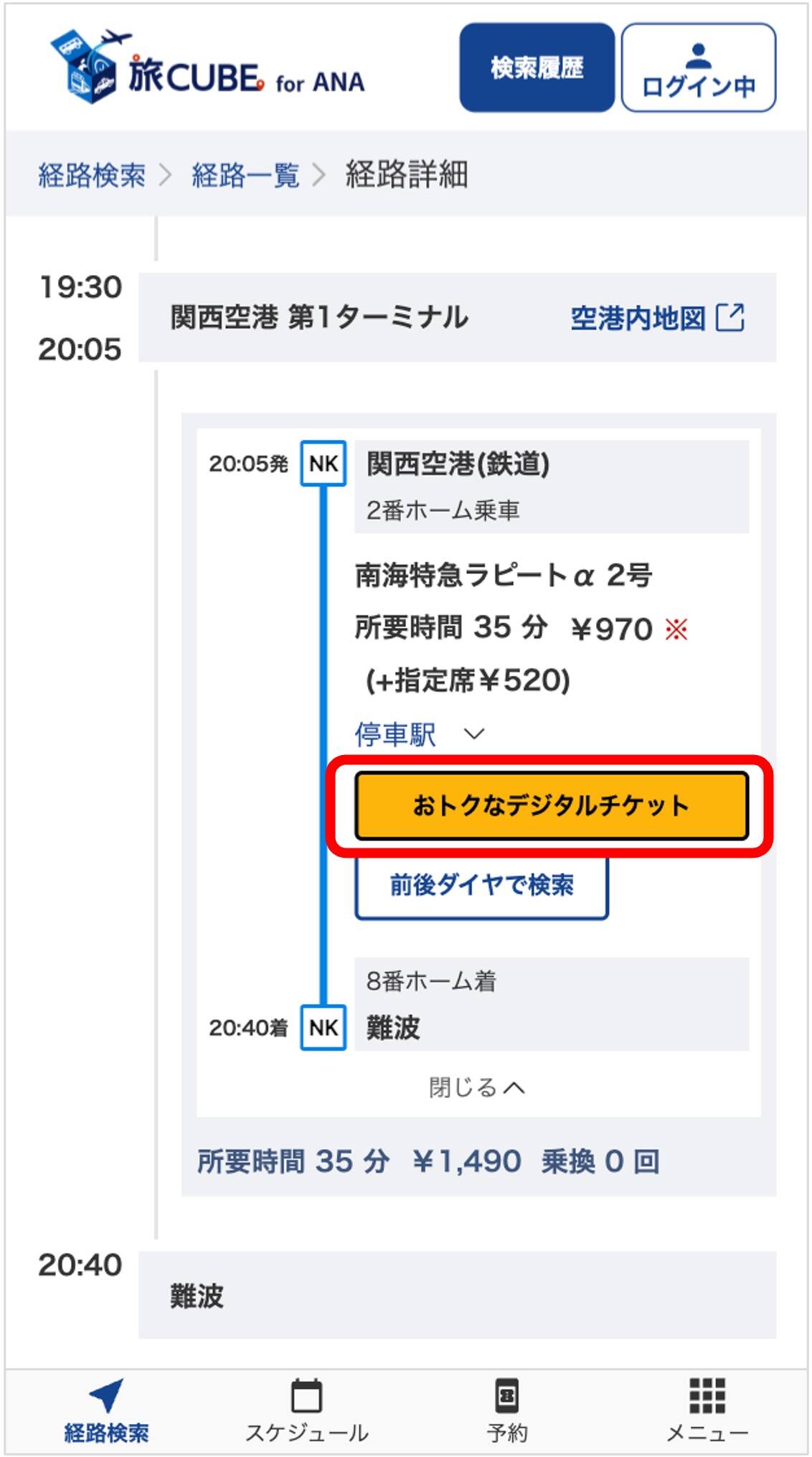 関西空港から/までの対象区間を含む任意の経路を検索します。