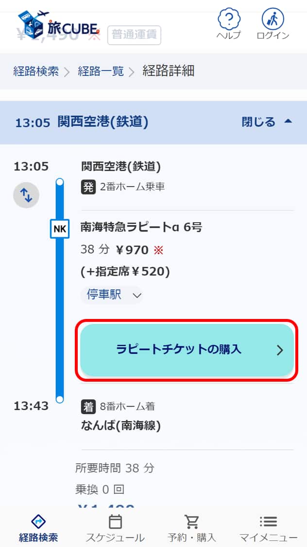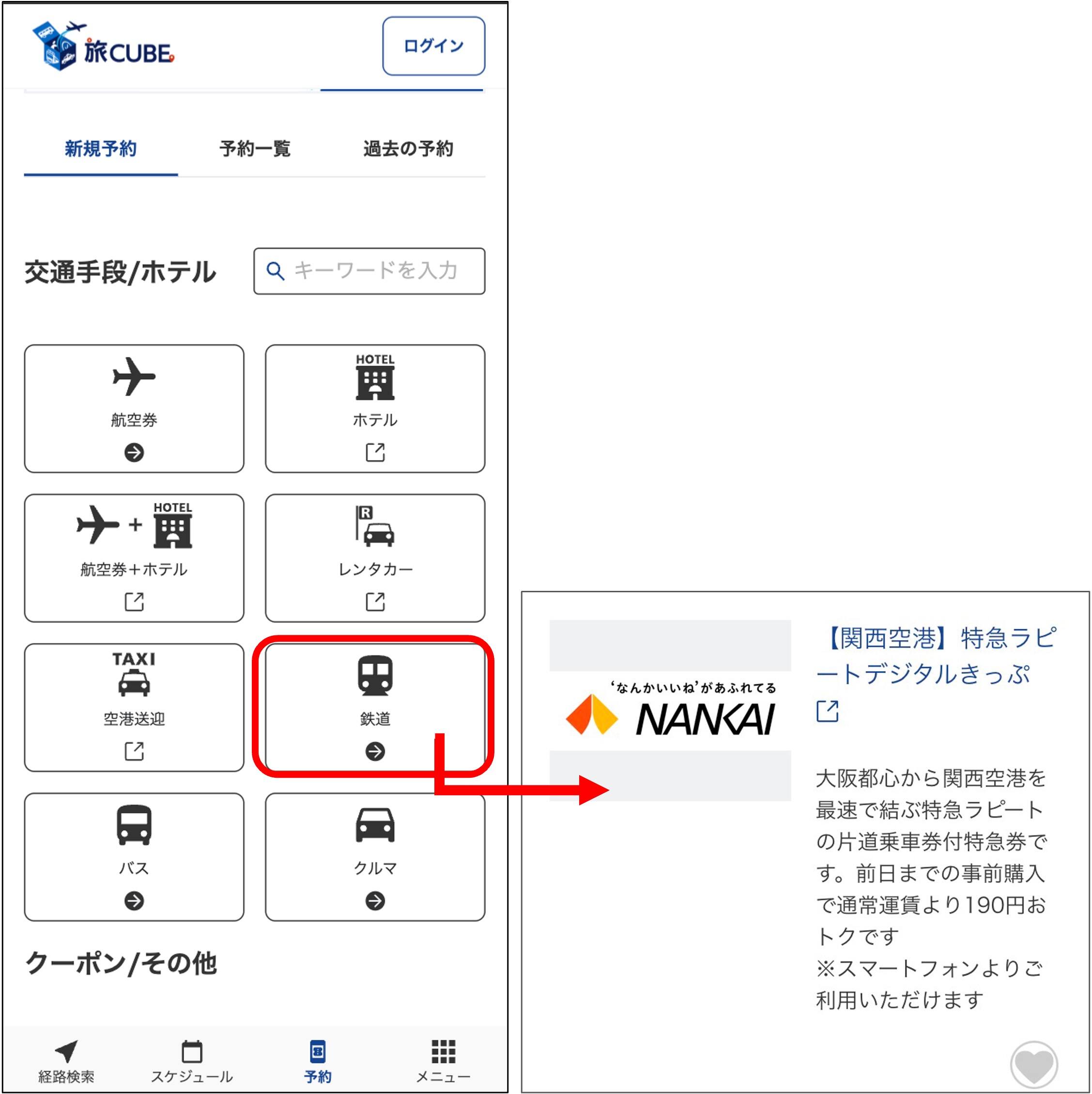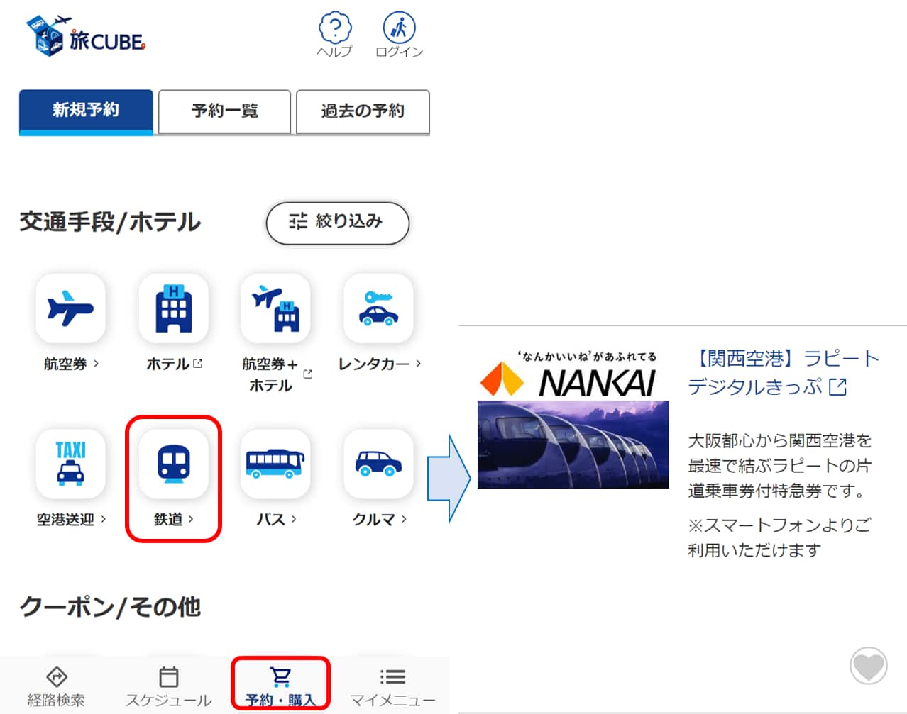 「旅CUBE」*1 の経路検索または予約タブより、南海電鉄「特急ラピートデジタルきっぷ」*2 のご購入が可能です。または当ページの「今すぐ購入する」ボタンからもご購入いただけます。
