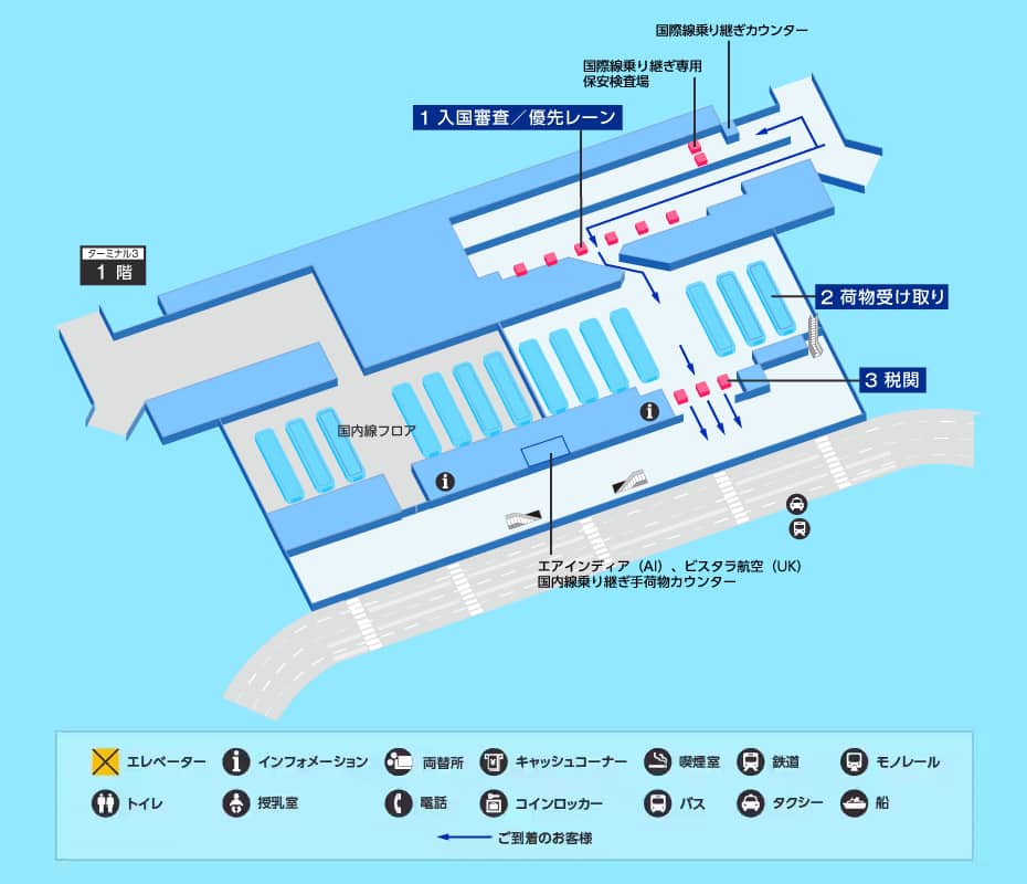 入国審査、手荷物引き取り、税関審査を通過し、お乗り継ぎ便の出発ターミナルをご確認のうえ、搭乗口へお進みください。