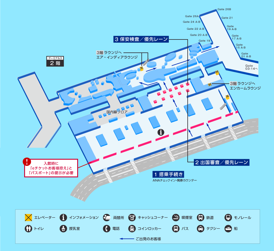 パスポートと搭乗券をご提示ください。 日本国籍を含む外国籍の方は出国カードの提出は不要です。 出国審査、保安検査の終了時、紙の搭乗券にそれぞれスタンプが押印されます。スタンプの押印がない場合、搭乗に時間を要しますので、必ずスタンプの押印を搭乗前にご確認ください。 またスタンプが押印された紙の搭乗券を紛失した場合、搭乗が出来ません。 いずれもお困りの場合は、搭乗口係員にお申し出ください。