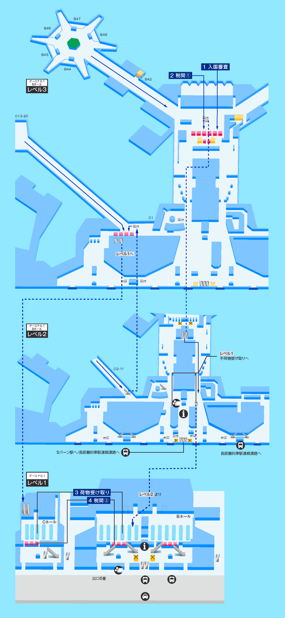 到着ゲートがA(A1~69、バスゲート)のお客様は、A15付近にあるエレベーターで地下へ進み、乗り継ぎトンネルを通り、Bゲートへお進みください。国内、シェンゲン協定国からC/D/Eゲートに到着後、搭乗券をお持ちでないお客様は、ターミナル1のBホールレベル2にある、ANAチェックインカウンター(ZONE14)で搭乗手続きを行ってください。その後、保安検査、出国審査を通過後、B搭乗ゲートへお進みください。その他レベル2には、インフォメーション、ルフトハンザビジネスラウンジ、ルフトハンザセネターラウンジ、エスカレーターとエレベーターがあります。ターミナル1のBホールレベル3にはインフォメーションと保安検査・保安検査優先レーンがあります。シェンゲン協定国以外からのお乗り継ぎのお客様で、Zゲート並びにターミナル2のD・Eゲートに到着した場合、ドイツに入国せずにスカイラインにてターミナル1のB・Cゲート駅へ進み、保安検査へとお進みください。