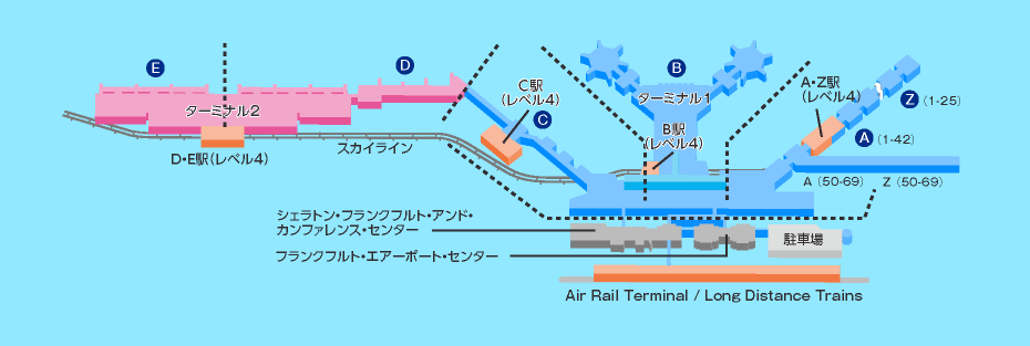 ターミナル1、2の各エリアをスカイラインが結んでいますA・Z駅、B駅、C駅は。ターミナル1のレベル4に、D・E駅はターミナル2のレベル4にあります。空港のターミナル1には、シェラトン・フランクフルト・アンド・カンファレンス・センターとフランクフルト・エアポート・センター、駐車場が隣接しており、連絡通路でAir Rail Terminal・Long Distance Trainsの駅がつながっています。