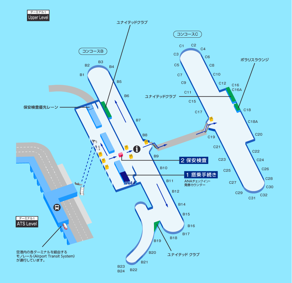 出発するターミナル1のATS Levelには、空港内の各ターミナルを経由するモノレール(Airport Transit System)の駅があります。そこからエスカレーターでUpper Levelへ進むと搭乗手続きを行うANAチェックイン・発券カウンターがあります。手続き後、保安検査、保安検査優先レーンへお進みください。通過後、コンコースBにはインフォメーションとユナイテッドクラブが、さらに進むとコンコースCにもユナイテッドクラブ、ポラリスラウンジがあります。