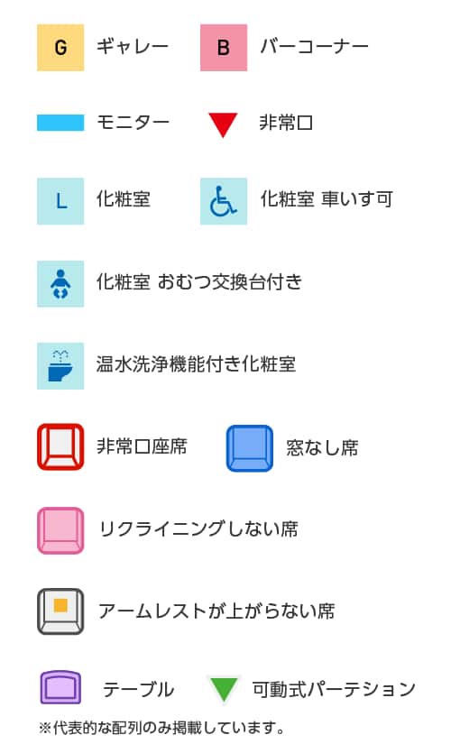 車いす利用可能な化粧室は、37列目のA、B、Cの後方に1ヶ所あります。おむつ交換台付きの化粧室は、1列目のA、Cの前方に1ヶ所、37列目のA、B、Cの後方に1ヶ所あります。