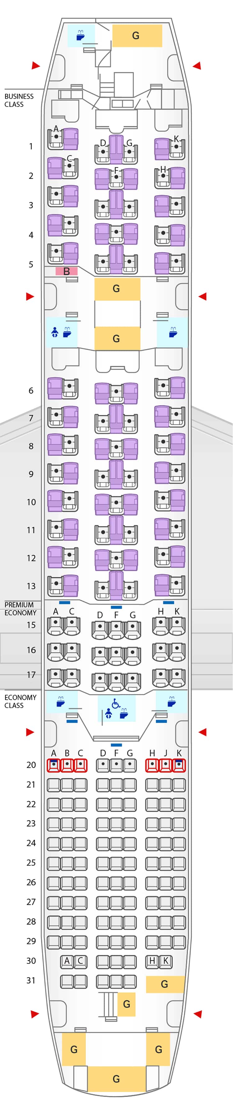 20列目から33列目までの座席の並びは、左からA、B、C、通路、D、F、G、通路、H、J、Kです。34列目の座席の並びは、左からA、C、通路、D、F、G、通路、H、Kです。35列目の座席の並びは、左からA、C、通路、D、F、Gです。非常口座席は、25列目のA、B、C、H、J、Kです。アームレストが上がらない席は、20列目と25列目のすべての座席です。窓なし席は、25列目と32列目のA、Kです。共用モニターは、20列目と25列目の前方に付いています。