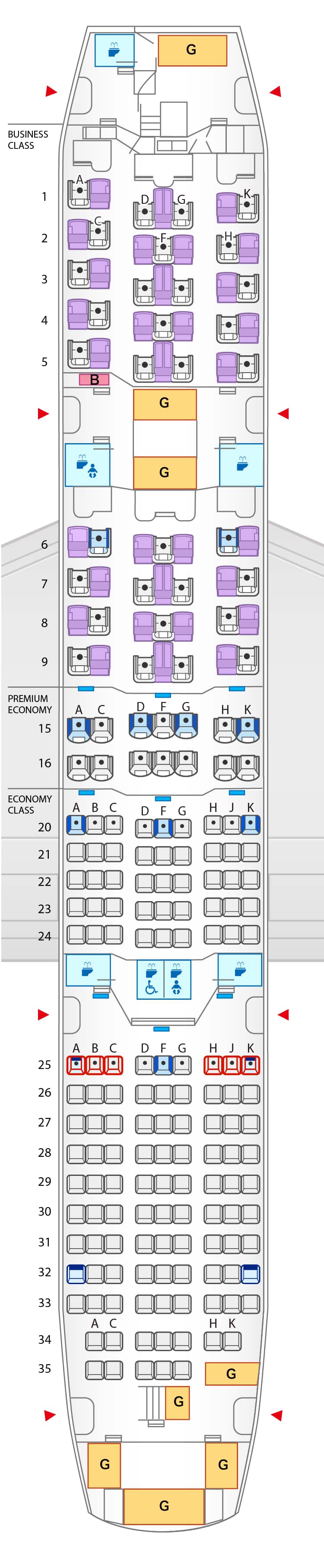 座席数は、ビジネスクラスが32席、プレミアムエコノミーが14席、エコノミークラスが138席です。座席列は、1列目から35列目まであります。