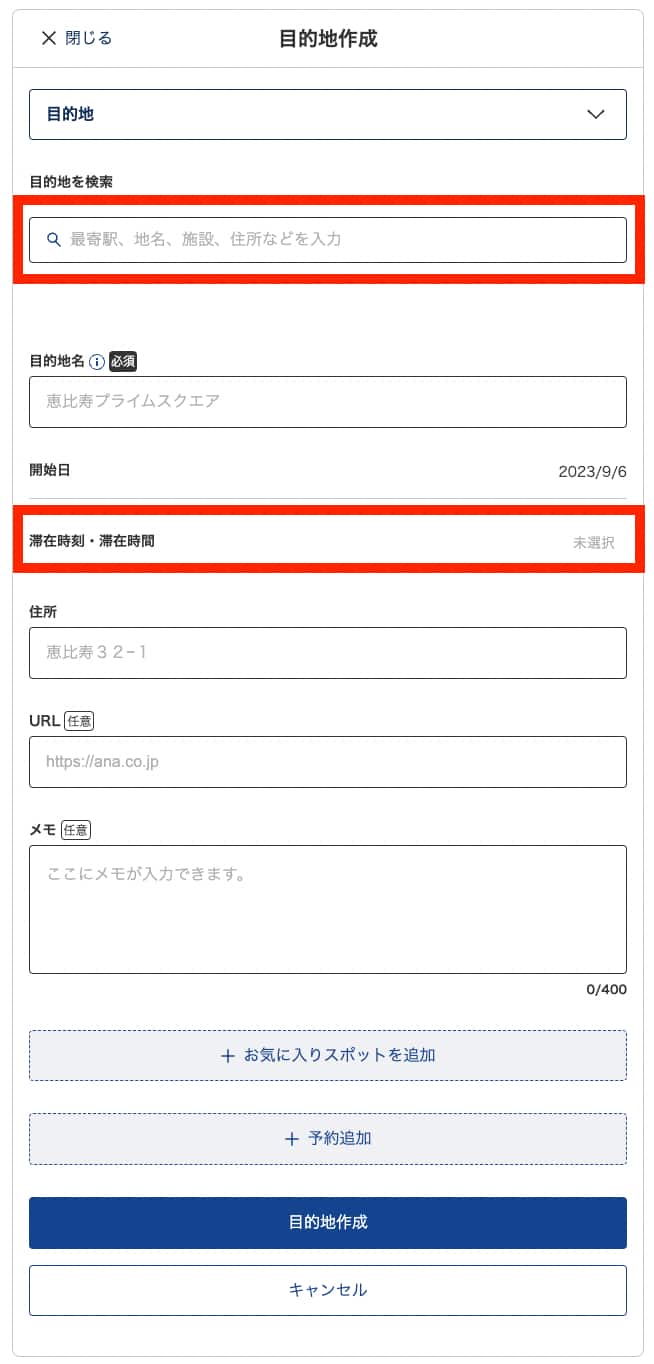 「目的地を追加/入れ替え/削除+」から前後に目的地を自由に追加し、滞在時間や滞在時刻を指定しながら登録する。