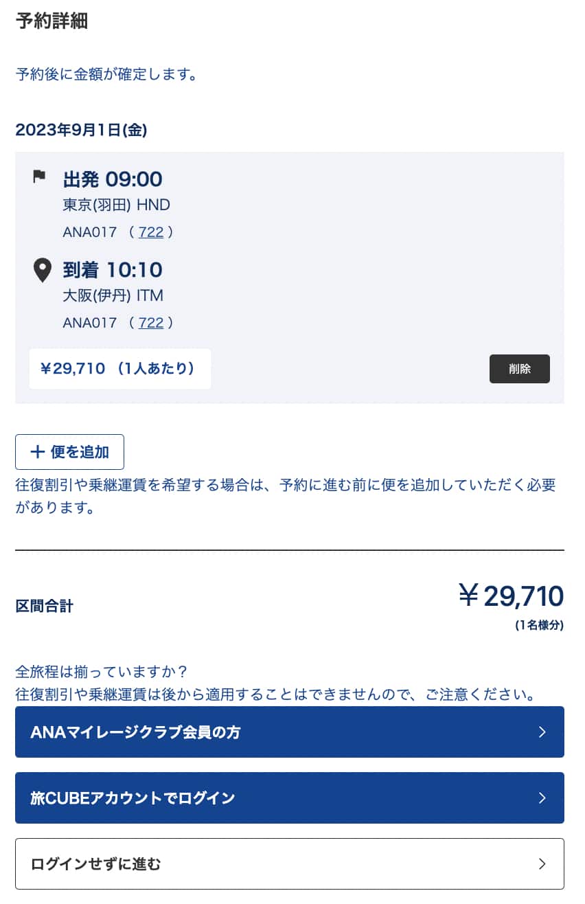 経路検索結果のANA航空便の箇所の「予約」ボタンから航空券の予約/購入に進むことが可能