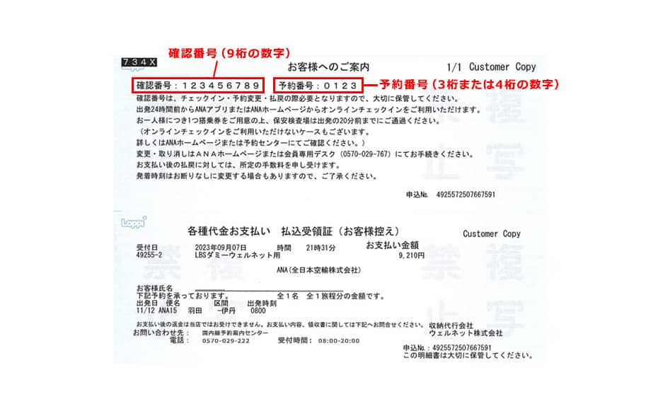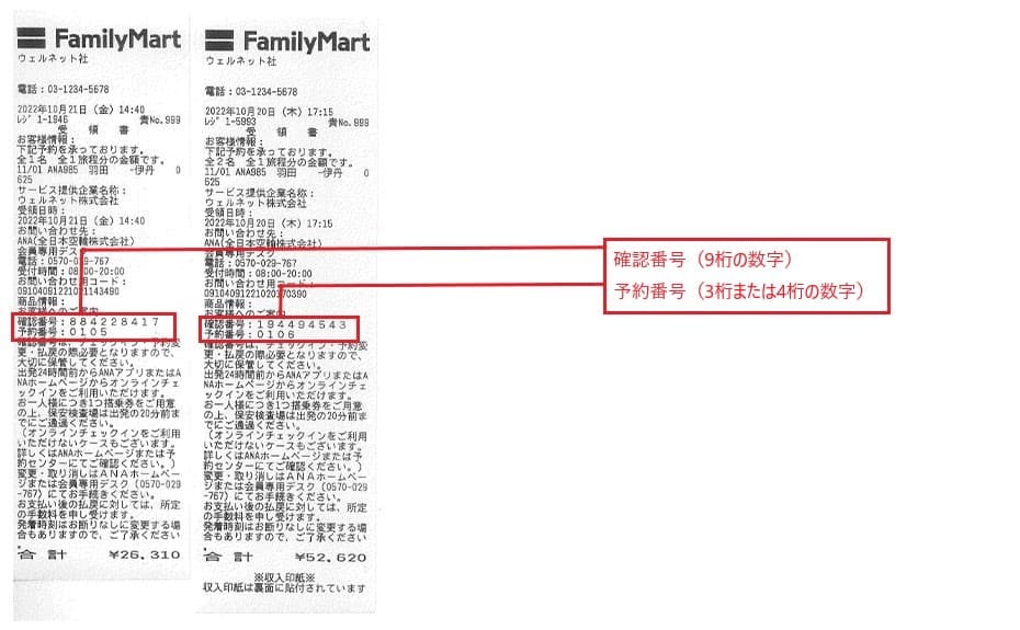 ANAマイレージクラブ会員以外のお客様は予約番号とあわせて、お支払いの際に発行される領収書(レシート形式)に記載されている確認番号をご搭乗当日ご持参ください。