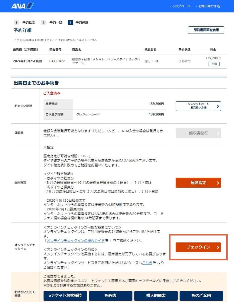 予約詳細画面の『オンラインチェックイン』欄の「チェックイン」ボタンをクリックする。