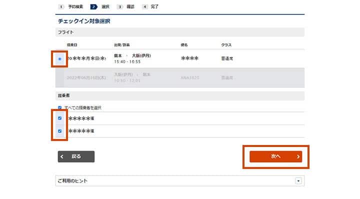 チェックイン対象選択画面でチェックインするお客様を選択する。