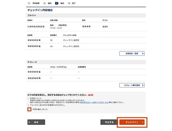 チェックイン内容確認画面で内容を確認し、「チェックイン」のボタンをクリックして手続き完了になります。