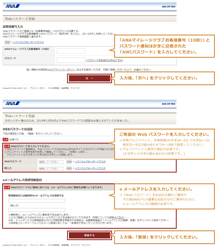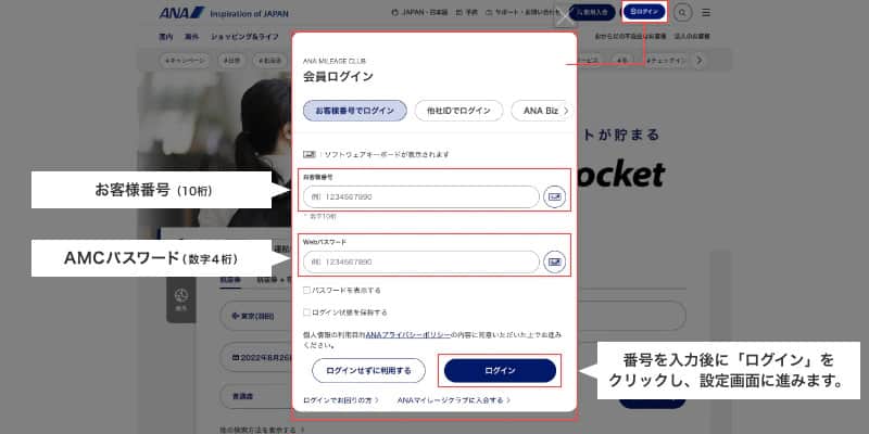 ANAウェブサイト トップページ内「ログイン」より「お客様番号(10桁)」と、Webパスワード欄に「 AMCパスワード(数字4桁) 」を入力し、ログインを押すと登録画面に進みます。