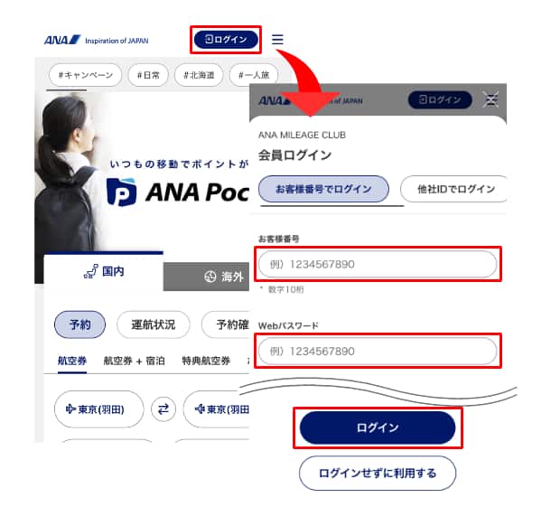 ANAウェブサイトへのログインには、ANAマイレージクラブお客様番号(10桁)とWebパスワードが必要です。