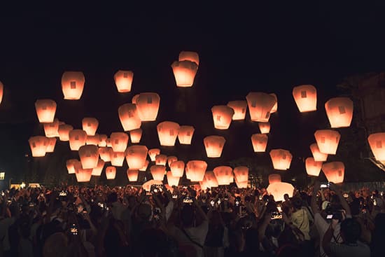 台湾の伝統的な行事の一つで、紙製の天燈に願い事を書いて、熱気球のように空に飛ばすイベントです。