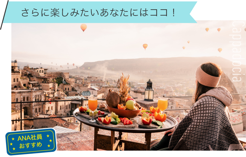 カッパドキアを一望できる洞窟ホテルから、朝焼けに染まる空に浮かぶ無数の気球を眺める体験は、まさに一生の思い出。カッパドキアの大自然と歴史が織りなす壮大な景観とこのユニークなホテルで、非日常の冒険をお楽しみください。