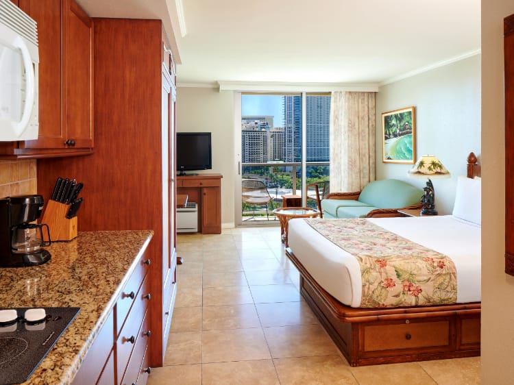 ワイキキビーチまでわずか3ブロックの立地で、全室小型の冷蔵庫、コーヒーメーカー、電子レンジを完備