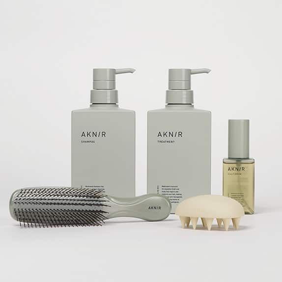 ヘアシャンプー、ヘアトリートメント、ヘアスカルプセラム、シャンプーブラシ、スカルプブラシが含まれた、AKNIRのヘアケアすべてを堪能できるパーフェクトセットに加え、ブランドファウンダーである梨花のサイン入りグッズがついたプレゼントです。