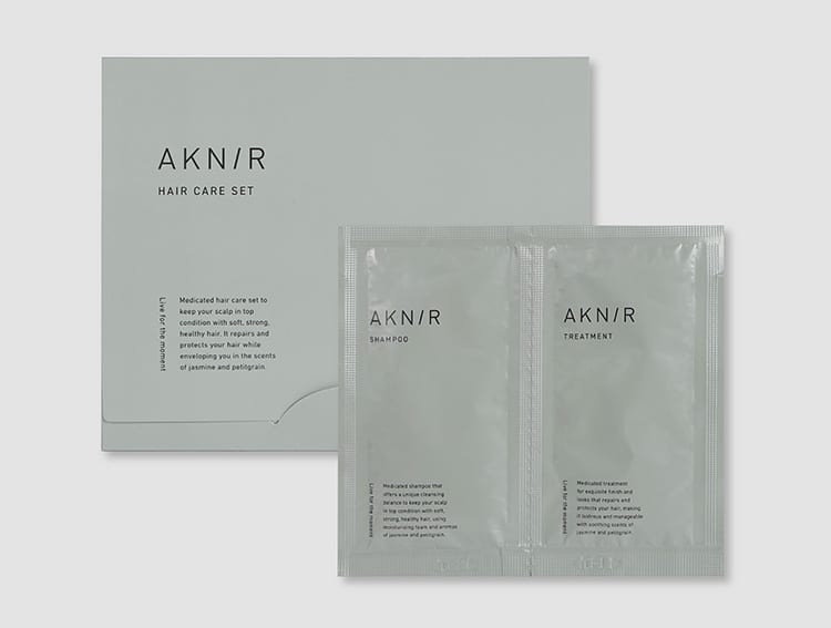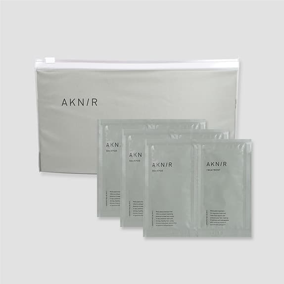 ヘアシャンプーとヘアトリートメントのトライアルが3セット入ったクリアポーチとAKNIRグッズのセットです。