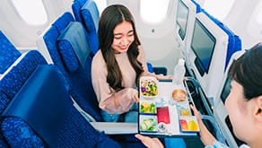 ご搭乗クラスの機内食はもちろん、お子様向けやアレルゲン対応、その他健康をサポートするお食事など、幅広い食習慣に寄り添った特別機内食を各種取り揃えております。プレミアムエコノミー・エコノミークラスのお客様は、通常の機内食とは一味違う、有料機内食サービスもご利用になれます。