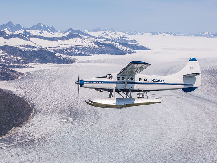 ジュノー周辺にある大きな氷河をアラスカ名物水上飛行機にて5つまわります。上空から俯瞰する大氷河は圧巻です。