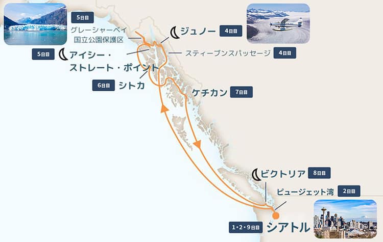 クルーズ中は一日に2隻しか航行が許されていなく、陸上からの接近ができないグレーシャーベイ国立公園で氷河クルーズををお楽しみいただきます。海上から氷河を鑑賞後は寄港地ジュノーで水上飛行機に乗ってダイナミックな氷山の景色を上空から俯瞰します。また、乗船前後にはシアトルの観光もお楽しみいただけます。