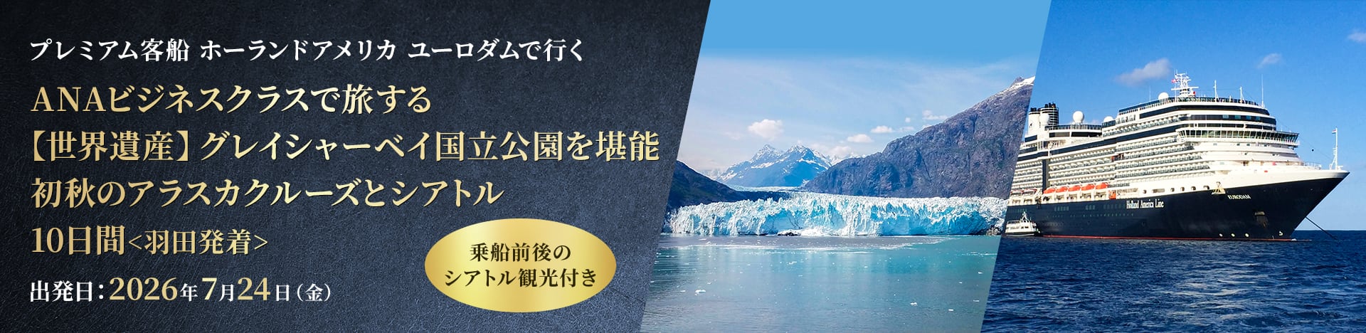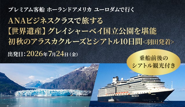 ワンランク上のプレミアム客船で旅するアラスカクルーズ旅。往復はANAビジネスクラスにて優雅に空の旅を満喫、船内ではベランダ付きの客室で景色を堪能しながら洋上の旅をゆったりとお楽しみいただけます。もちろん日本出発から帰国まで添乗員が同行しますのでクルーズ発着前後、船内も安心です。