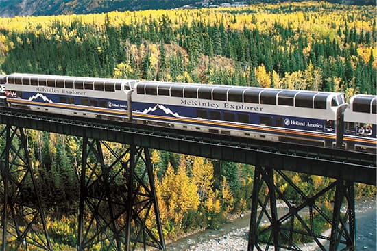 アンカレッジからデナリのアラスカ鉄道では、ホーランドアメリカラインのお客様専用車両のマッキンリーエクスプローラーに乗車します。