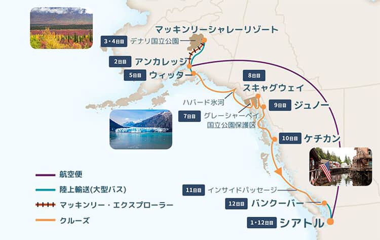 1日目シアトル到着日から12日目シアトル空港到着までホーランドアメリカ社が主催する観光ツアーに同乗する混載ツアーとなります。バス、列車などはほかのお客様とご一緒になります。