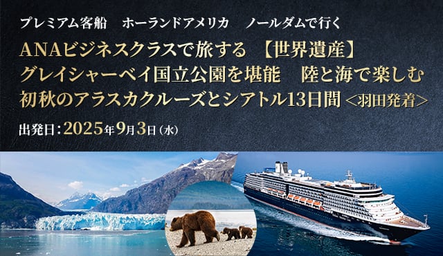 ワンランク上のプレミアム客船で旅するアラスカクルーズ旅。往復はANAビジネスクラスにて優雅に空の旅を満喫、船内ではベランダ付きの客室で景色を堪能しながら洋上の旅をゆったりとお楽しみいただけます。もちろん日本出発から帰国まで添乗員が同行しますのでクルーズ発着前後、船内も安心です。