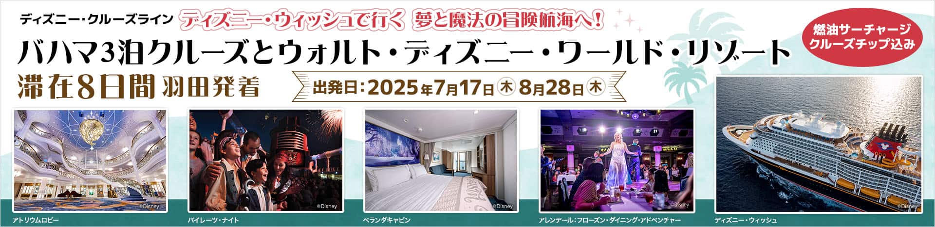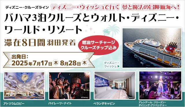 バハマの首都「ナッソー」と、ディズニー・クルーズラインのお客様だけが訪れることのできる特別なプライベートアイランド「キャスタウェイ・ケイ」への訪問で寄港地も充実。クルーズ関連諸税、船内チップもツアー代金に含まれています。