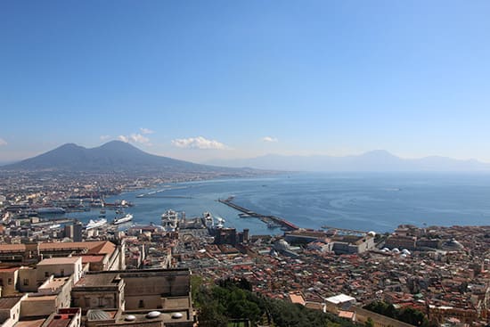 美港として知られるナポリではお天気が許せば港からも雄々しい火山、ベスビオ山を望むことができます。