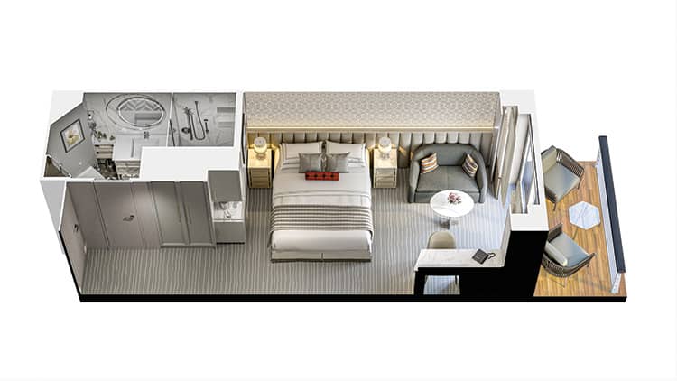 シャワールーム(シャワーのみ)/2名1室利用時:ツインベッド・1名1室利用時:ダブルベッド/インタラクティブテレビ/金庫/プライベートベランダ/冷蔵庫付きミニバー/24時間ご利用可能なルームサービス/バスローブとスリッパ/ヘアドライヤー/ヘアドライヤー