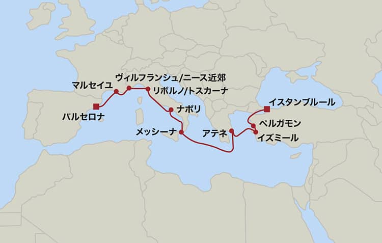 乗船時のイスタンブール、下船時のバルセロナ含め乗船中のトルコ、ギリシアの寄港地では専用車での観光もお付けしました。イタリア、フランスの寄港地では情緒ある港付近や旧市街散策をお楽しみいただけます。