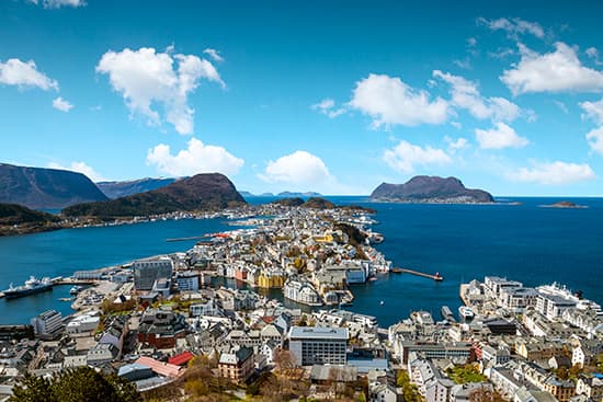 ノルウェー西海岸に位置する港町オーレスンは色取り取りの建物が並ぶかわいい街並みが魅力。アール・ヌーヴォー調の建物が並ぶ統一感あふれる風景をご覧ください。