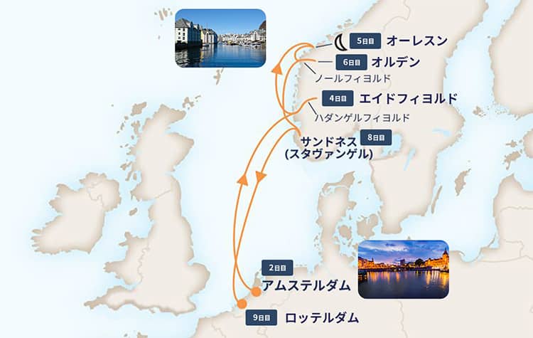 アムステルダムから出発し、ロッテルダムで下船する北欧クルーズは、雄大な自然と文化に触れる絶好の機会です。ノルウェーの港に寄港し、色とりどりの建物が美しい街オーレスンを散策。また、5大フィヨルドの中でも特に人気の高いハダンゲルフィヨルドとノールフィヨルドを訪れ大自然のパノラマビューを満喫します。雄大なフィヨルドクルーズ、歴史ある街並み、美しい自然。このクルーズで、忘れられない北欧の思い出を作りましょう。