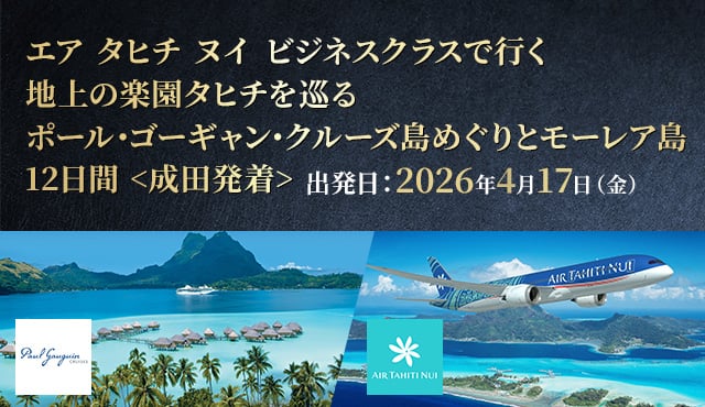 南太平洋の楽園をオールインクルーシブ船 ポール・ゴーギャン・クルーズで満喫いただきます。日本からの往復はエア タヒチ ヌイ ビジネスクラス直行便にて、洋上からはタヒチの島々を巡る極上の旅をお楽しみください。